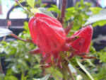 Kelompok bunga rosella berwarna merah tua, tebal, dan berair. Semakin pekat warna merahnya, rasanya semakin asam dan tentu juga khasiatnya semakin besar. Tanaman ini mudah sekali tumbuh.